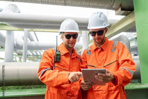 Two male petrochemical engineers with walkie-talkie and tablet working and discussing inspection and maintenance plans for pipelines for oil and gas at petroleum refinery, power plant energy industry.