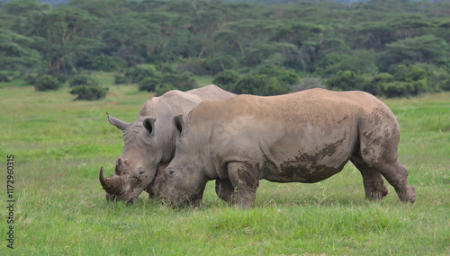 two male southern white rhinos test their strength and dominance in a sparring round in the wild plains of solio game reserve, kenya