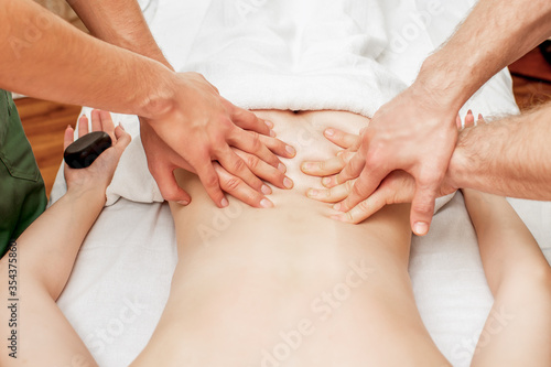 Two masseurs are working simultaneously on the patient back. 4 hands massage.
