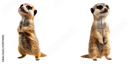 suricate, animal, standing, upright, alert, curious, mammal, wildlife, nature, fur, small, social, group, desert, habitat, africa, watchful, cute, posture, pair, together, sandy, environment, eye, ear, tail, paw, whisker, vigilant, community, family, behaviour, interaction, outdoors, natural, scene, wild, fauna, ecosystem, survival