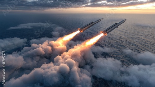missile, launch, fire, smoke, cloud, ocean, sunset, sky, military, weapon, technology, power, war, conflict, danger, destruction, airborne, strategic, rapid, speed, flight, aerial, defense, attack, threat, force, launching, projectile, weaponry, explosive, kinetic, high technology, modern, future, dangerous, hostile, potential, system, warfare, precision, guided, trajectory, operation, weapon