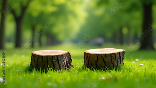 Two natural wooden tree stumps are placed on green grass with a blurred park background of lush fresh greenery._00001_