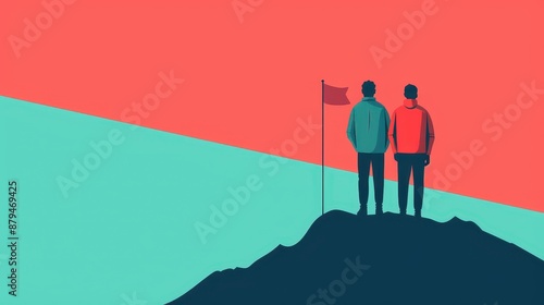 illustration, 2, people, standing, mountain summit, flag, tone, sky, symbolize, milestone, oneness, scenery, spirit, partnership, vista, achievement, endeavour, mission, landscape, mountain, graphic, effort, ambition, victory, conquest, courage, horizon, challenge
