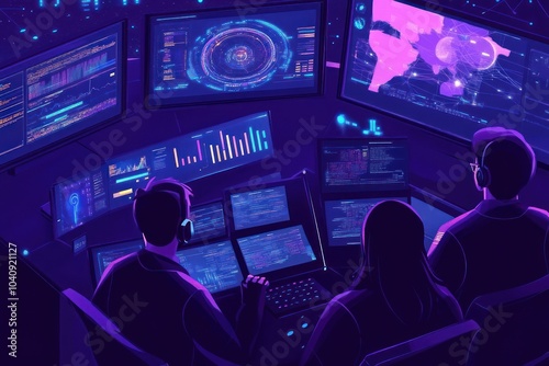 technology, digital, network, cyberspace, datum, system, computer, monitor, screen, code, chart, graph, connection, map, earth, global, security, people, teamwork, communication, information, design, illustration, futuristic, neon, purple, blue, dark, background, abstract, concept, future, modern, interface, user, web, app, software, hardware, program, programmer, analyst, hacker, coding, developer