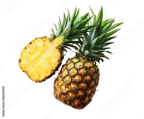 Two pineapples, one whole and one halved, showcasing the vibrant yellow flesh and green leaves