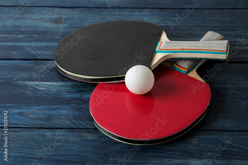 Two ping pong rackets. Table tennis rackets and a ball on a blue wooden table. sport game.