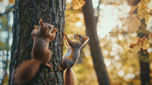 Two Playful Squirrels Climbing a Tree in Golden Autumn Light