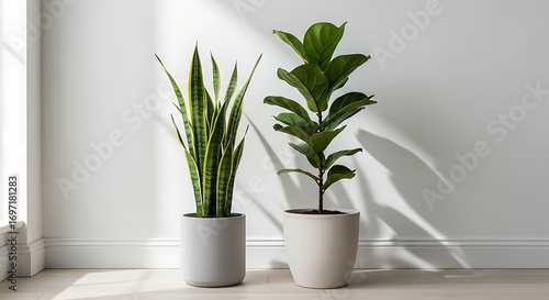 Two potted houseplants snake plant and fiddle leaf fig near window with natural light