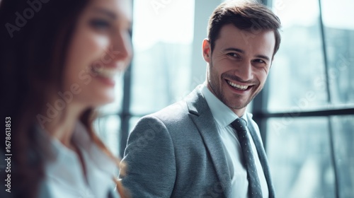 office, professional, discussion, business, meeting, conversation, work, colleague, teamwork, communication, workplace, interaction, corporate, smiling, bright, natural light, collaboration, indoor, modern, executive, sharpened, positive, exchange, negotiation, workspace, environment, attire, happy, engaged, talking, planning, strategy, productive, friendly, success, cheerful, confident