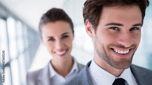 Two professionals in business attire stand together in a modern office, smiling confidently.