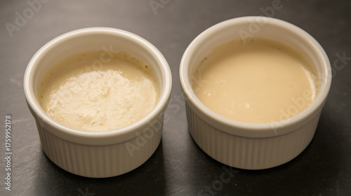 Two ramekins filled with creamy, pale yellow desserts, set against a dark, neutral surface, showcase a simple yet elegant treat. The white bowls contrast with the dessert.