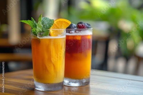 Two refreshing fruit drinks, garnished with citrus and berries.