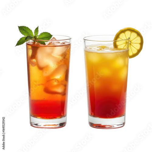 Two refreshing layered cocktails with ice and garnishes presented against a transparent background