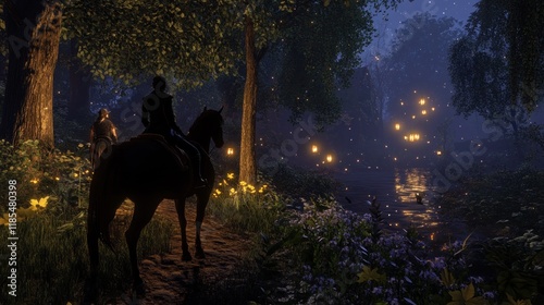 flower, nature, romantic, water, green, enchantment, leaf, river, adventure, artwork, digital, dreamy, path, grass, serene, horse, purple, shadow, peaceful, horseback, moody, mystical, silhouette, yellow, fog, rider, fairy tale, twig, tranquil, magical, tree, night, mystery, illustration, blue, light, enchanted, forest, rider, fantasy, art, dark, glowing