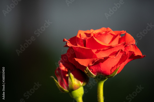 Two scarlet roses in the garden on a summer day.