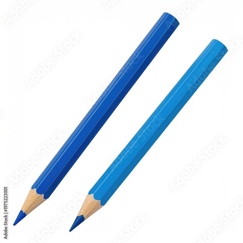 Two sharpened blue colored pencils on a white background perfect for artistic drawing and creative coloring projects