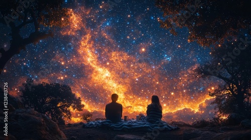 night, sky, star, forest, nature, landscape, scenic, environment, adventure, astronomy, galaxy, universe, silhouette, people, couple, sitting, cosy, blanket, thermos, peaceful, tranquil, dreamlike, magical, mystical, romantic, love, emotion, feeling, atmosphere, wonder, awe, nightscape, celestial, aethereal, serene, contemplative, sentimental, atmospheric, captivating, enchanting, alluring, dreamy