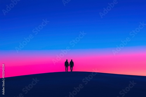 Two Silhouettes Holding Hands on a Hilltop with a Vibrant Pink and Blue Gradient Sky