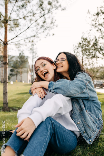 woman, young, student, sister, friends, best friend, hugging, girl, together, goggles, eyeglass, friendship, smart, sitting, grass, smiling, people, brunette, outdoors, happy, smile, 2, jean, casual attire, lifestyle, outside, park, nature, leisure, spring, summer, cheerful