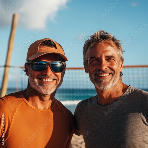 beach, man, friends, smiling, sunglasses, hat, casual attire, summer, vacation, leisure, lifestyle, happiness, togetherness, relaxation, fun, adventure, travel, ocean, sky, horizon, nature, active, healthy, fit, mature, adult, middle-aged, positive, cheerful, friendly, bonding, human relationships, carefree, enjoyment, outdoors, sunny, blue, warm, coastal, avocation, social, friendship, male, portrait