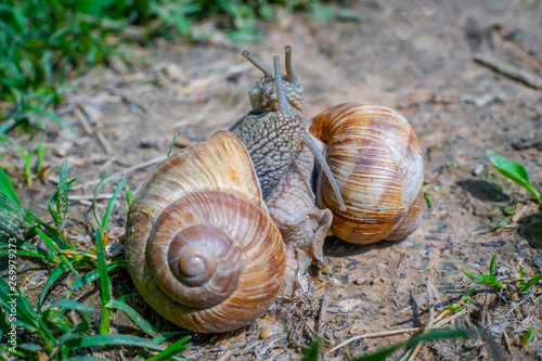 Two snails on the ground among the grass interact with each other. Animal world of nature