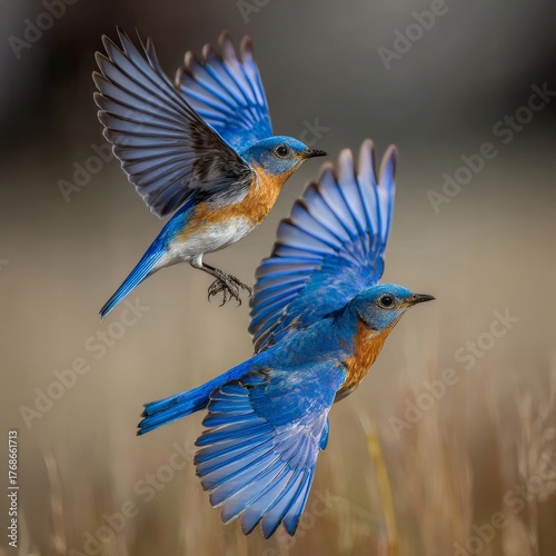 Two vibrant bluebirds with spread wings captured mid-flight against soft natural background