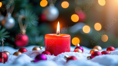 candle, white, snow, ball, pink, gold, purple, tree, light, green, red, ornament, ball, light, blur, yellow, background, foreground, decoration, festive, christmas, holiday, celebration, winter, season, joy, peaceful, relaxing, calm, serene, cosy, warm