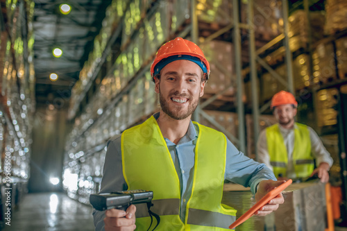 warehouse, storage, industrial, industry, manufacture, plant, retail, shipping, indoor, commercial, freight, cardboard box, container, box, delivering, color image, shelf, pallet, transportation, merchandise, working, men at work, helmet, vest, tablet, device, electronic, scanner, young adult
