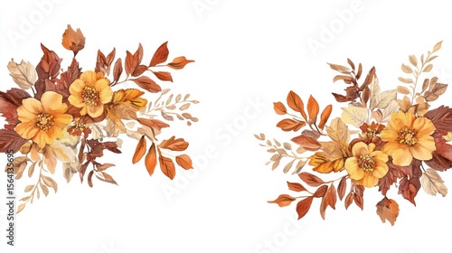 Two watercolor floral arrangements featuring autumnal colors, with yellow flowers and brown, beige, and orange leaves