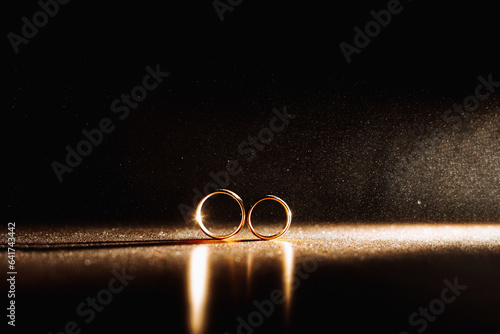 Two wedding rings in infinity sign with sparkling light mist. Love concept on black background