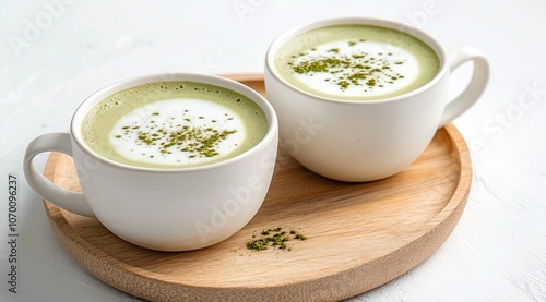 Two white cups of matcha latte on a wooden plate isolated on white background.