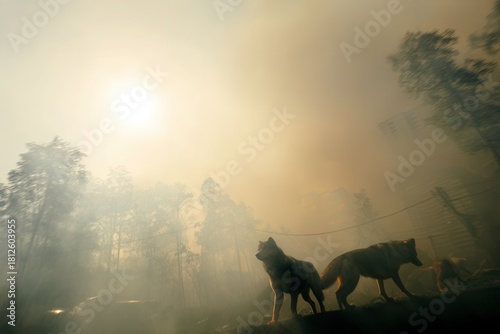wolf, fire, smoke, forest, wildfire, nature, danger, animal, haze, disaster, wild, predator, survival, environment, burning, tree, landscape, mysterious, fog, apocalypse, sun, silhouette, ecology, climate, destruction, heat, orange, mist, dramatic, ominous, wood, mammal, canino, wildlife, emergency, global, warming, pollution, smog, fear, dark, light, shadow, atmospheric, scene, background, concept, blur