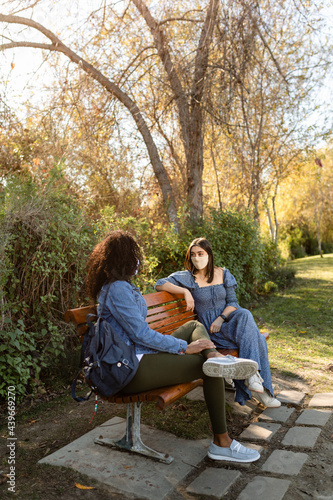 attractive, beautiful, casual attire, city, face mask, friends, health, leisure, lifestyle, nature, outdoors, pandemic, park, picnic, recreation, relaxation, smile, tree, woman, woman
