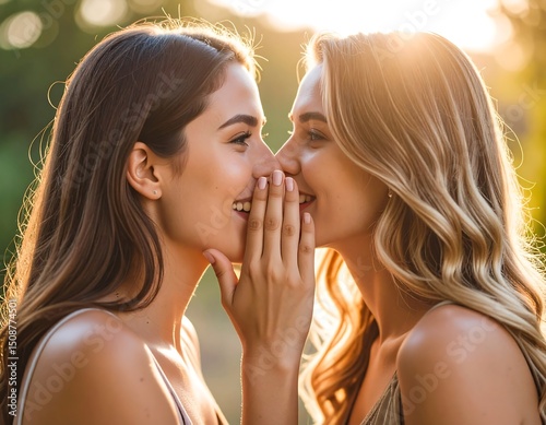 woman, girl, couple, love, affection, intimacy, tenderness, romance, friendship, happiness, joy, smile, laughter, close, together, sunlight, gold, sunset, outdoors, nature, park, background, bokeh, beauty, pretty, attractive, gorgeous, elegant, stylish, hair, long, brown, blond, skin, face, eye, lip, hand, touch, whisper, secret, carefree, playful, connection, bond