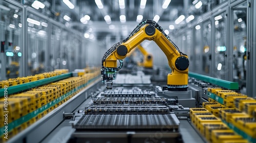 robot, arm, robotic, automation, manufacturing, factory, industry, production, line, assembly, conveyer, belt, machinery, technology, modern, industrial, equipment, workplace, workspace, future, innovation, progress, efficiency, productivity, advanced, intelligence, artificial, system, process, operation, task, job, work, metal, yellow, black, grey, light, bright, clean, organised, precision, repetitive