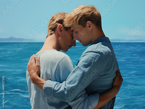 intimate, romance, friends, love, friendship, feeling, lesbian, gay, february 14, birthday, mother's day, greeting, celebration, banner, postcard, 2, young, beautiful, blond, man, background, blue, sea, couple, homosexual, hug, boyfriend, happy, man, human relationships, male, blond, together, gay, guy, romantic, caucasian, casual attire, smile, partner, photogenic, lifestyle, human, adult, person, happiness, positive