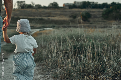 Two-year-old child in a hat walks along a country road, summer. Knowledge of the world.