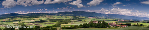 Typical pastoral view on green meadows, castles, railway and small factories in Switzerland