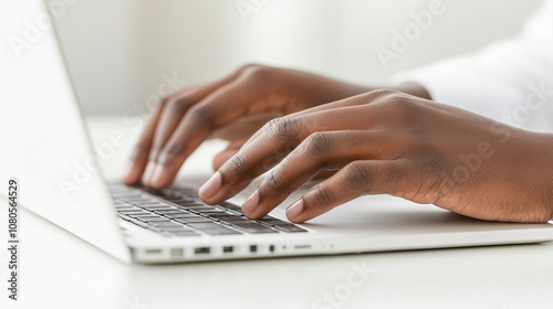 Typing hands on laptop keyboard, showcasing focus and productivity in modern workspace. image captures essence of work and technology in serene environment