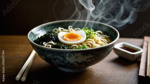 udon, noodle, soup, soy sauce, wasabi, chopstick, steaming, food photography, asian cuisine, broth, condiment, savoury, seaweed, green onion, soup bowl, comfort food, wooden table, ramen, favor, seasoning