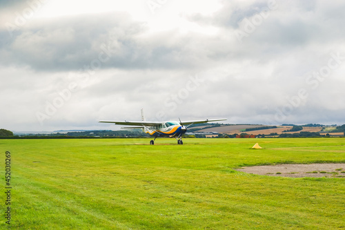 UK, Salisbury, 15.08.2021: a small plane from 'GoSkydive' awaits people to land for parachute jumping