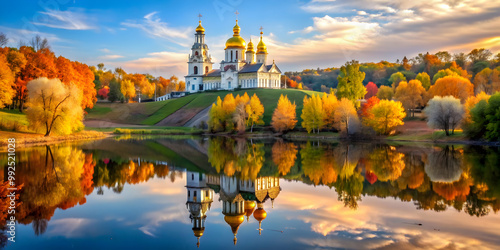 Ukrainian Borisoglebsk Cathedral reflecting in autumn colors, Ukraine, Borisoglebsk Cathedral, reflection, autumn