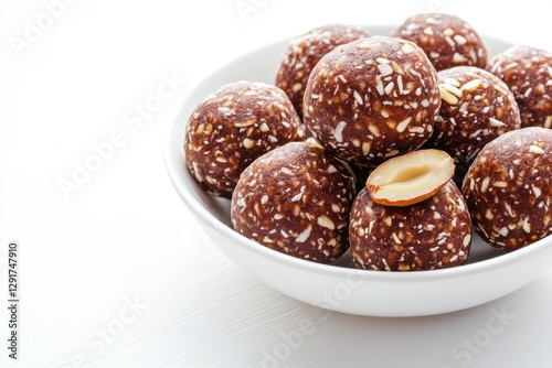 Ultra Detailed View of Raw Cacao Energy Balls in a White Bowl
