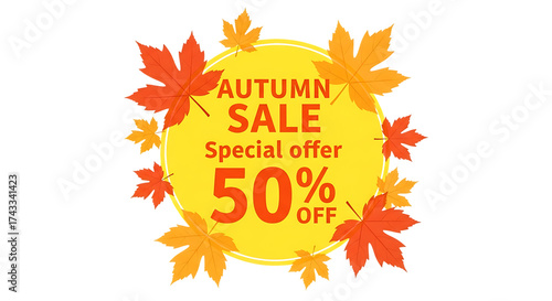 autumn, fall, sale, offer, discount, percent, off, 50, maple, leaf, leaf, season, seasonal, promotion, deal, shopping, retail, advertisement, marketing, special, price, yellow, orange, red, colours, design, graphic, element, symbol, shape, modern, clean, simple, flat, commerce, consumer, nature, tree, plant, botanical, harvest, transparent, isolated, alpha