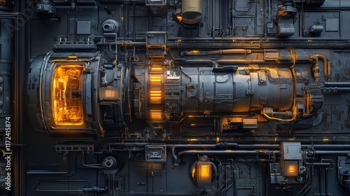 ultramodern industrial machinery in a high-tech factory setting, detailed metallic textures, glowing operational panels, advanced engineering design, industrial lighting ambiance