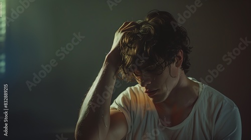 Um jovem solitário angustiado, isolado no seu quarto escuro, sintomas da depressão como ansiedade e culpa