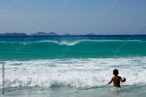 Um menino está de frente para o mar, entre a espuma branca, observando as ondas quebrando, esperando o momento certo para mergulhar. O céu é azul e o mar tem vários tons de azul e verde transparente.