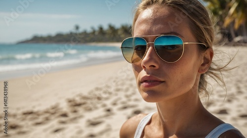 woman, beach, sunglasses, summer, vacation, portrait, sun, sea, sand, ocean, beauty, travel, heaven, blue, tropical, shangri-la, coast, holiday, daylight, natural, goggles, reflexion, goggles, gold, relax, composure, face, eye, closeup, person, outdoors, sunny, clearly, water, horizon, adventure, elegant, modern, blond, hair, littoral, daytime, attractive, pretty, confident, peaceful