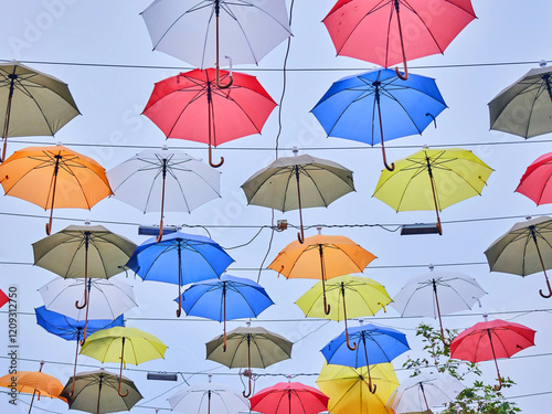 umbrella, sky, blue, red, parasol, street, background, decorative, colours, yellow, green, pattern, art, many-coloured, weather, beauty, bright, travel, variety, design, concept, rain, sunny, holiday, summer, open, hanging, sun, protection, many, sunshade, high-coloured, orange, rainbow, day, outside, object, abstract, culture, style, vibrant, city, artistic, conceptual, colourful, nobody, tour tourism