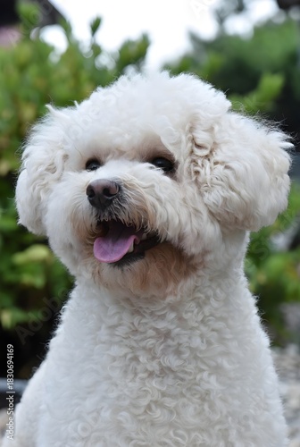 Una fotografía de un perro maltipoo en un entorno al aire libre divertido con vegetación borrosa. Un perro está sonriendo.